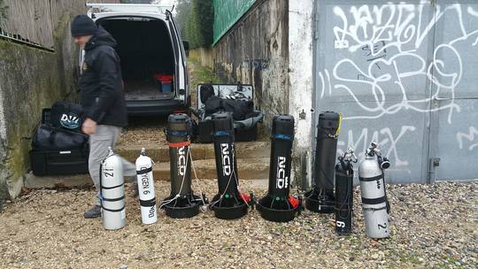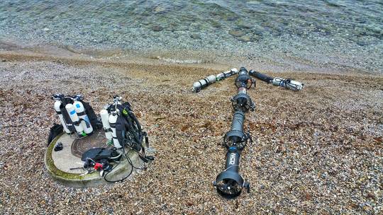 Scherzando disegniamo con i quattro Suex XK 1 e le bombole decompressione una freccia che indica l’isola che non c’è. Coniamo la frase “il messaggio è chiaro seguire la freccia“ e pubblichiamo la foto su FB. Con tranquillità ci prepariamo per l’immersione. Tato chiama casa e, prendendosi un pò di respiro informa che saremo di ritorno alle 13:30. Mai previsione fu più lontana dalla realtà. Terminati i preparativi entriamo in acqua e scopro che Tato è diventato l’uomo “bolla”.